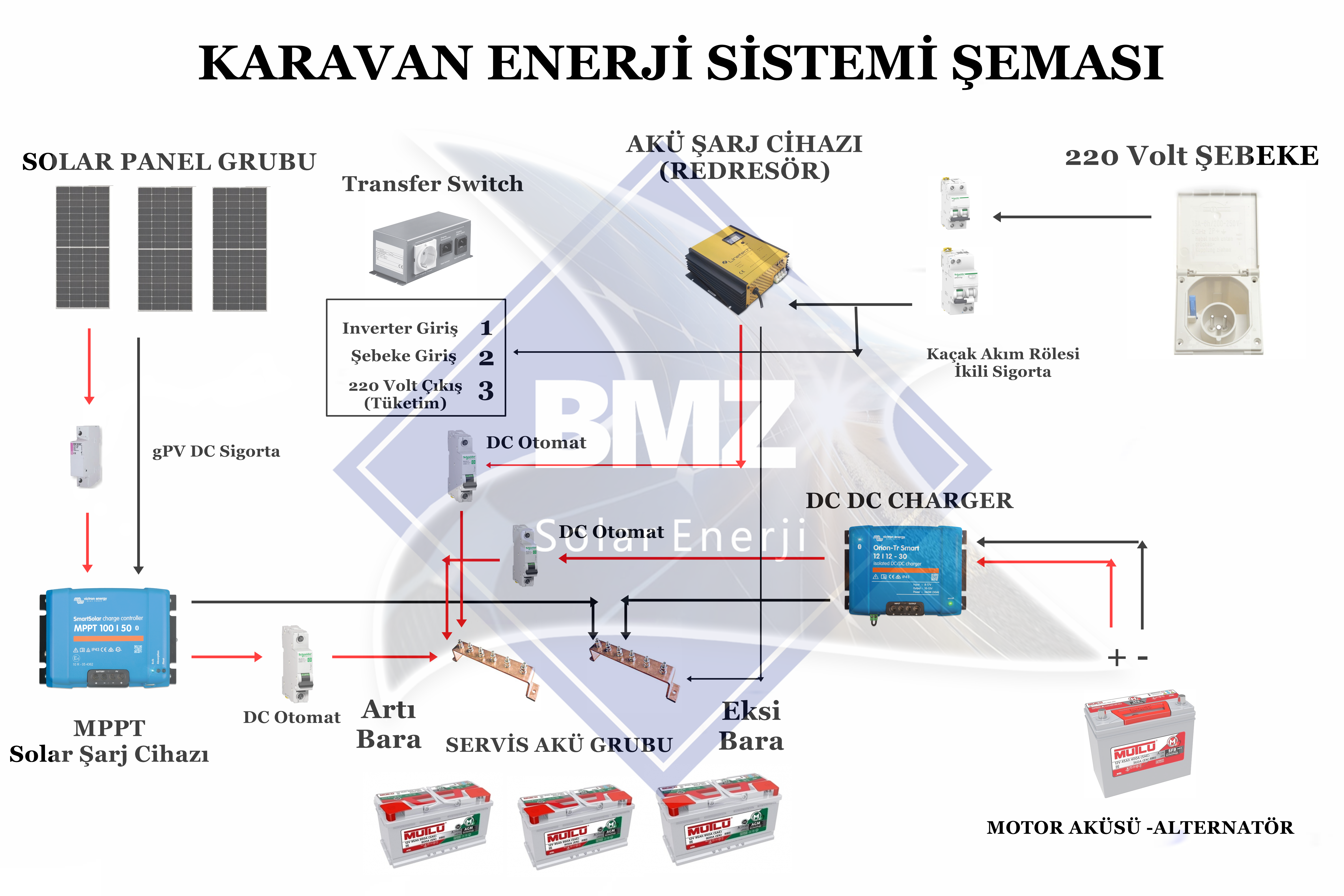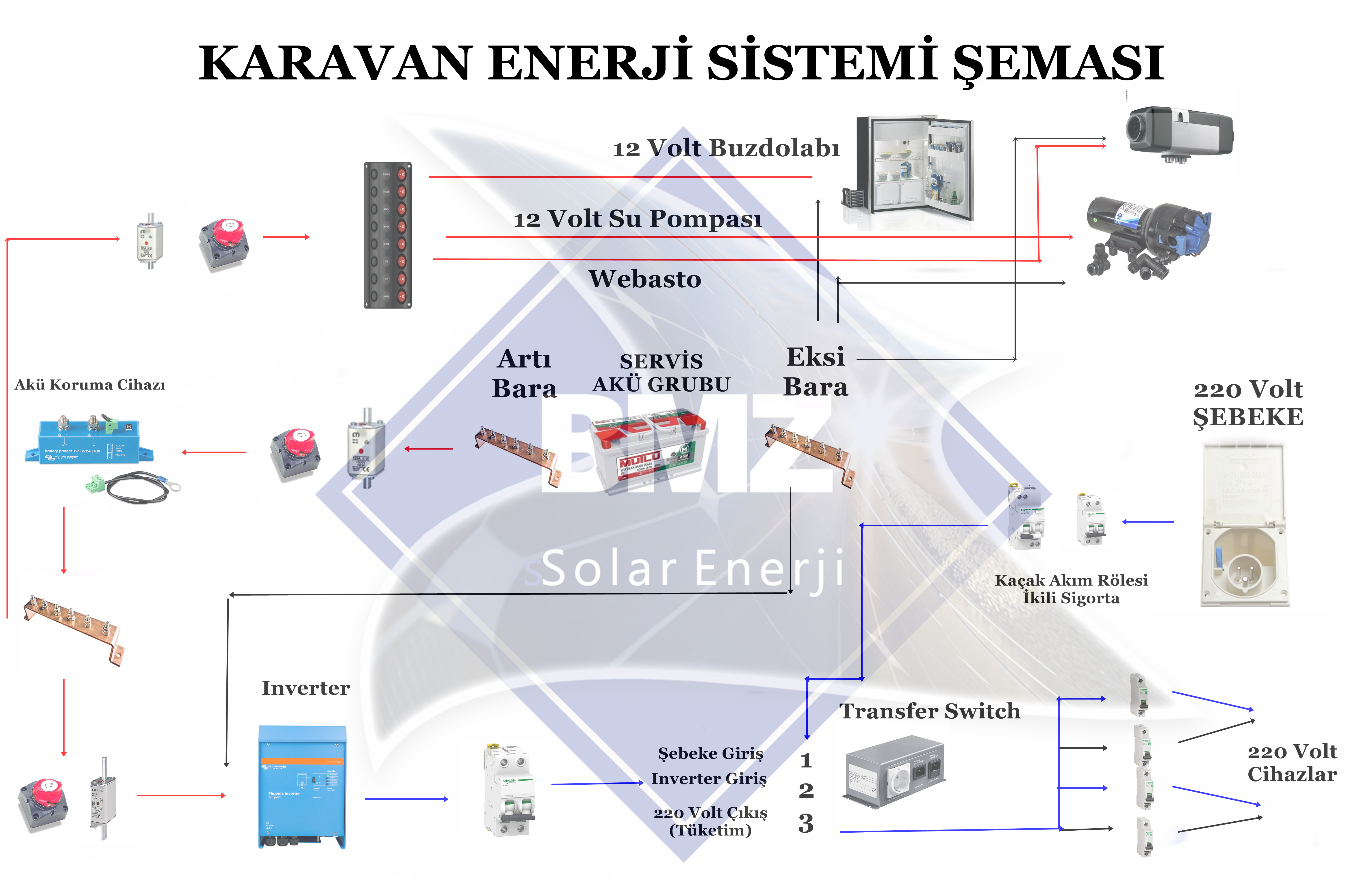 Karavandaki elektrikli aletleri çalıştırmak için enerji sistemi üç ana kısımdan oluşur. Servis aküsü enerjiyi depolar ve doğru akım(12-24-48 Volt ) cihazları doğrudan çalıştırır. Akü Koruma Cihazı akünün gerekenden fazla deşarj olmasını engelleyerek akünün bozulmasını engeller.